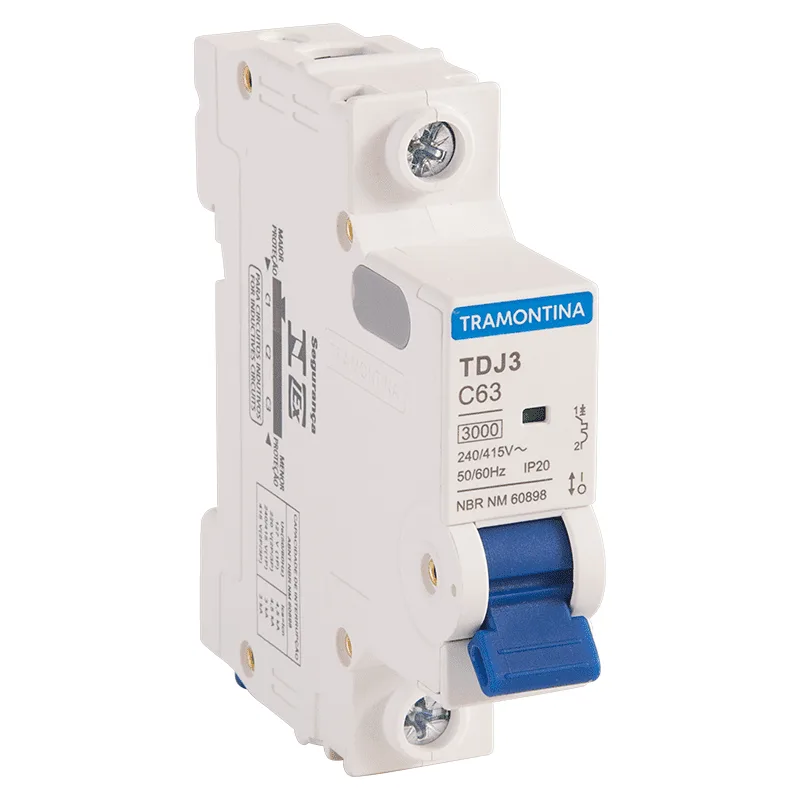 A proteção de circuitos elétricos contra sobrecarga e curto-circuito é uma exigência técnica e de segurança em qualquer instalação, seja residencial, comercial ou industrial. O Minidisjuntor Monopolar TDJ3-1C63 Tramontina foi desenvolvido para interromper automaticamente o circuito sempre que uma corrente acima do limite nominal for detectada, evitando danos  aos equipamentos conectados e reduzindo o risco de incêndios elétricos. Com corrente nominal de 63A e capacidade de interrupção de 3kA, este disjuntor monopolar 63a atende às demandas de circuitos de maior carga, como os utilizados em chuveiros elétricos de alta potência, ar-condicionados split, fornos elétricos e quadros de distribuição em ambientes comerciais. Conheça mais sobre a linha elétrica Tramontina e seus dispositivos de proteção para instalações de baixa tensão.