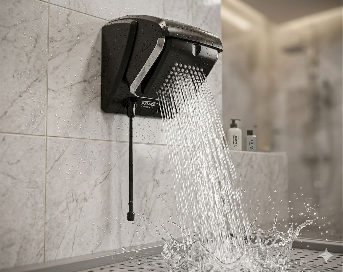 Quem trabalha com instalações elétricas residenciais sabe que a escolha de uma ducha eletrônica vai muito além do preço na prateleira. É preciso avaliar potência, compatibilidade elétrica, normas de segurança e desempenho térmico. A Ducha Compacta Black 127V 5400W foi desenvolvida com sistema eletrônico de controle de temperatura, atendendo às exigências da norma NBR 5410 e oferecendo compatibilidade com dispositivo DR em qualquer condição de água, do fornecimento normal ao salobro. Com 5.400W de potência nominal e opção econômica de 2.480W, este produto entrega desempenho real para uso residencial diário, com instalação prática e design compacto que se adapta a diferentes ambientes.
