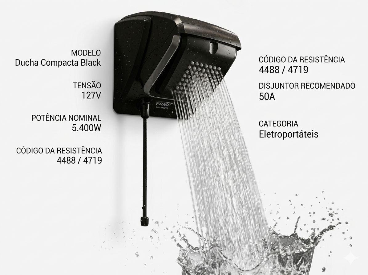 O disjuntor recomendado para a Ducha Compacta Black 127V 5400W é de 50A, com circuito exclusivo e condutor de no mínimo 10,0 mm². Usar um disjuntor subdimensionado causa desarmamentos frequentes e pode danificar os condutores por aquecimento excessivo. O circuito deve ser exclusivo para a ducha, sem compartilhamento com outras cargas.