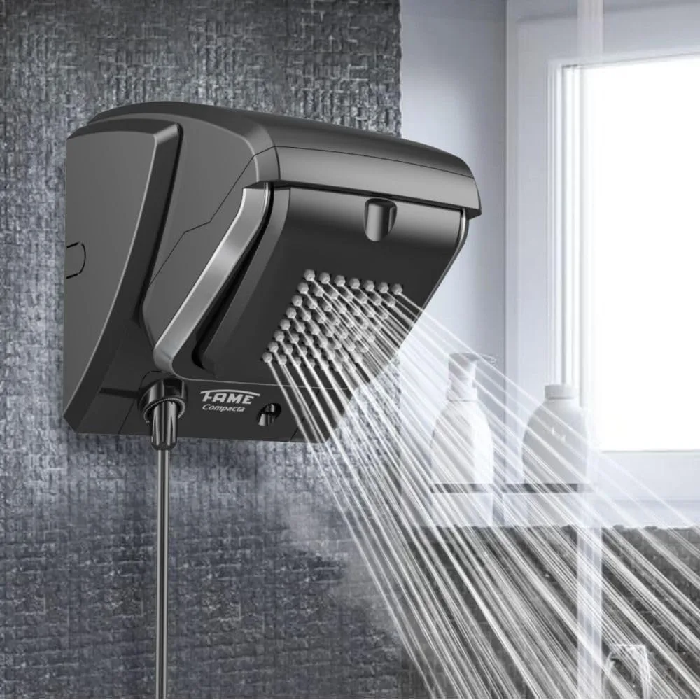 A ducha eletrônica aquece a água instantaneamente no momento do banho, sem necessidade de reservatório. O aquecedor por acumulação armazena um volume de água aquecida previamente, o que pode ser vantajoso em famílias numerosas com alto consumo simultâneo. A Ducha Compacta Black pode operar como complemento de um sistema por acumulação, ativando o aquecimento elétrico apenas quando a temperatura da água armazenada não for suficiente, combinando os dois sistemas de forma eficiente.