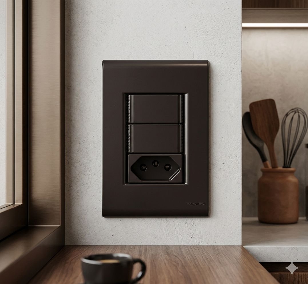 Sim, a linha Tramontina Liz Grafite oferece diversas configurações de conjuntos 4×2, incluindo versões com apenas tomada, com dois interruptores, com tomadas de 20A e outras combinações. Isso permite padronizar toda a instalação elétrica de um ambiente com o mesmo acabamento grafite brilhante, mantendo a uniformidade visual em todos os pontos da parede.
