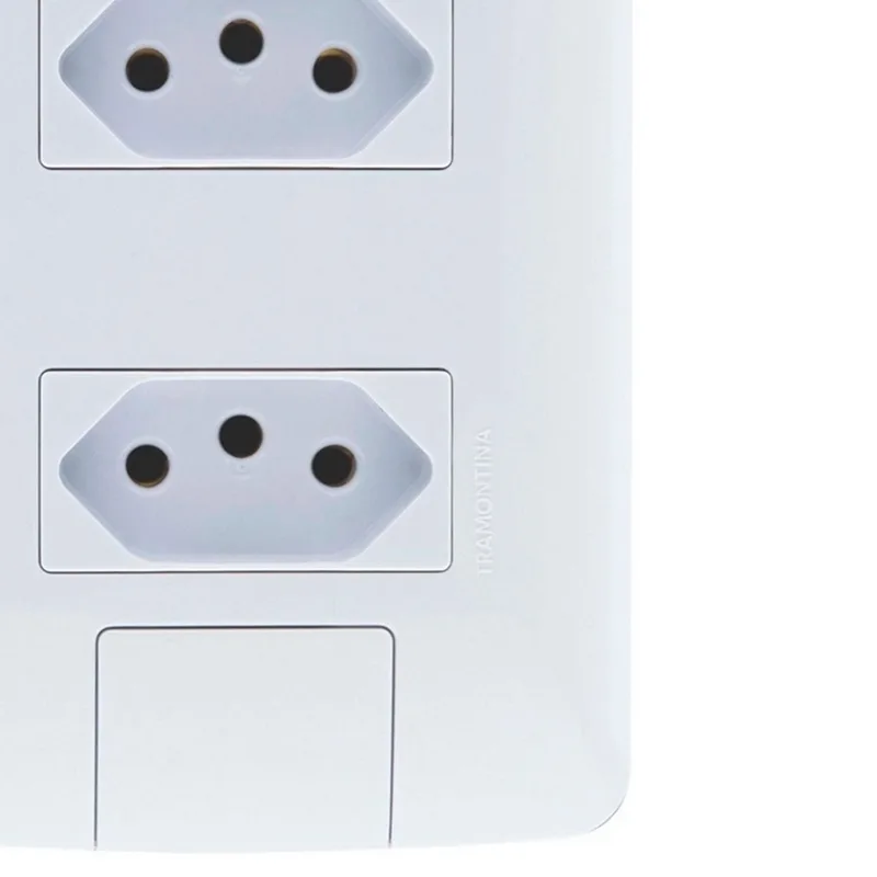 Este conjunto traz duas tomadas 2P+T em uma única placa 4×2, ideal para ambientes que precisam de dois pontos de energia independentes. A versão com interruptor simples substitui uma das tomadas por um interruptor, sendo mais indicada para pontos onde se quer controlar uma luminária ou ventilador junto a uma tomada de uso geral.