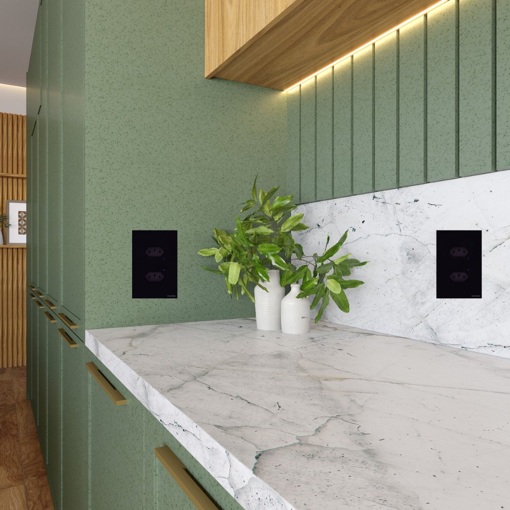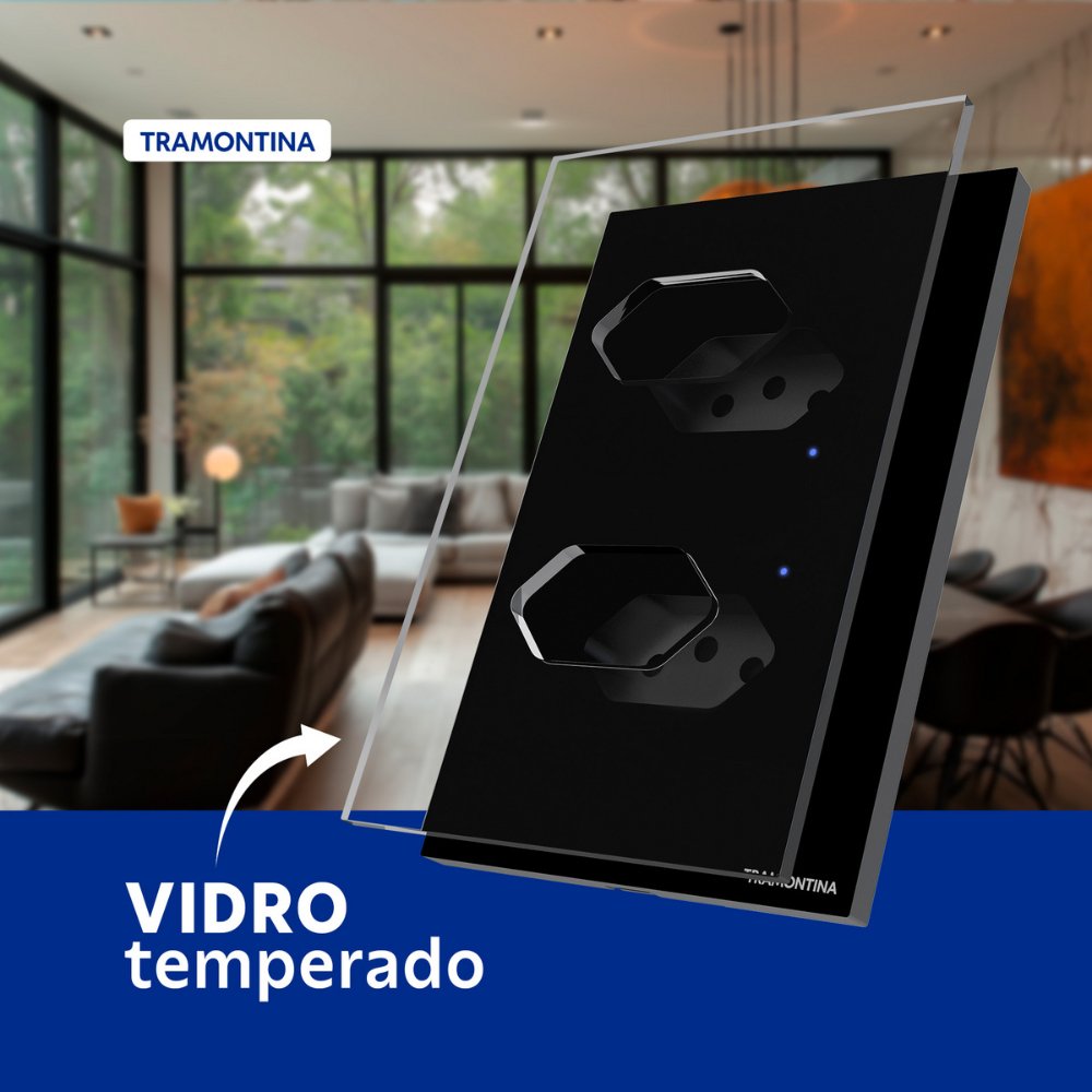Tomada Interruptor Botão Touch Onne Smart Tramontina Preto 2 Tomadas 2P+T 10A 250V Led Azul Alexa Google Assistente
